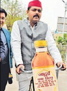 SP MLA Brijesh Yadav arrived draped in a poster that read, “Expose the syrup scandal.” SP MLC Ashutosh Sinha reached the Assembly on a bicycle carrying a bottle labelled “cough syrup,” bearing a message:
