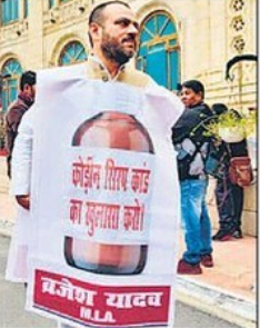 Outside the House, the cough syrup issue continued to dominate the scene. On the first day of the winter session, Samajwadi Party legislators protested in their own distinctive style.