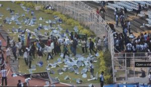 This further inflamed the crowd. Fans uprooted chairs and hurled them inside the stadium.