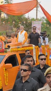 PM Narendra Modi’s road show before nomination saw people lined up on the road in Varanasi on Monday. Residents were seen watching the show from roof tops and balconies of their houses. PM was accompanied by UP CM Yogi Aditya Nath. The rath was decked up with flowers and crowd chanted Jai Shri Ram and flung flowers at Modi.