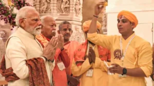 Inside the temple complex, Modi and Bhagwat jointly performed rituals at the Ram Darbar, with CM Yogi and Governor Patel standing behind them. The PM and the RSS chief later descended to the ground floor to offer prayers before the idol of Ram Lalla.